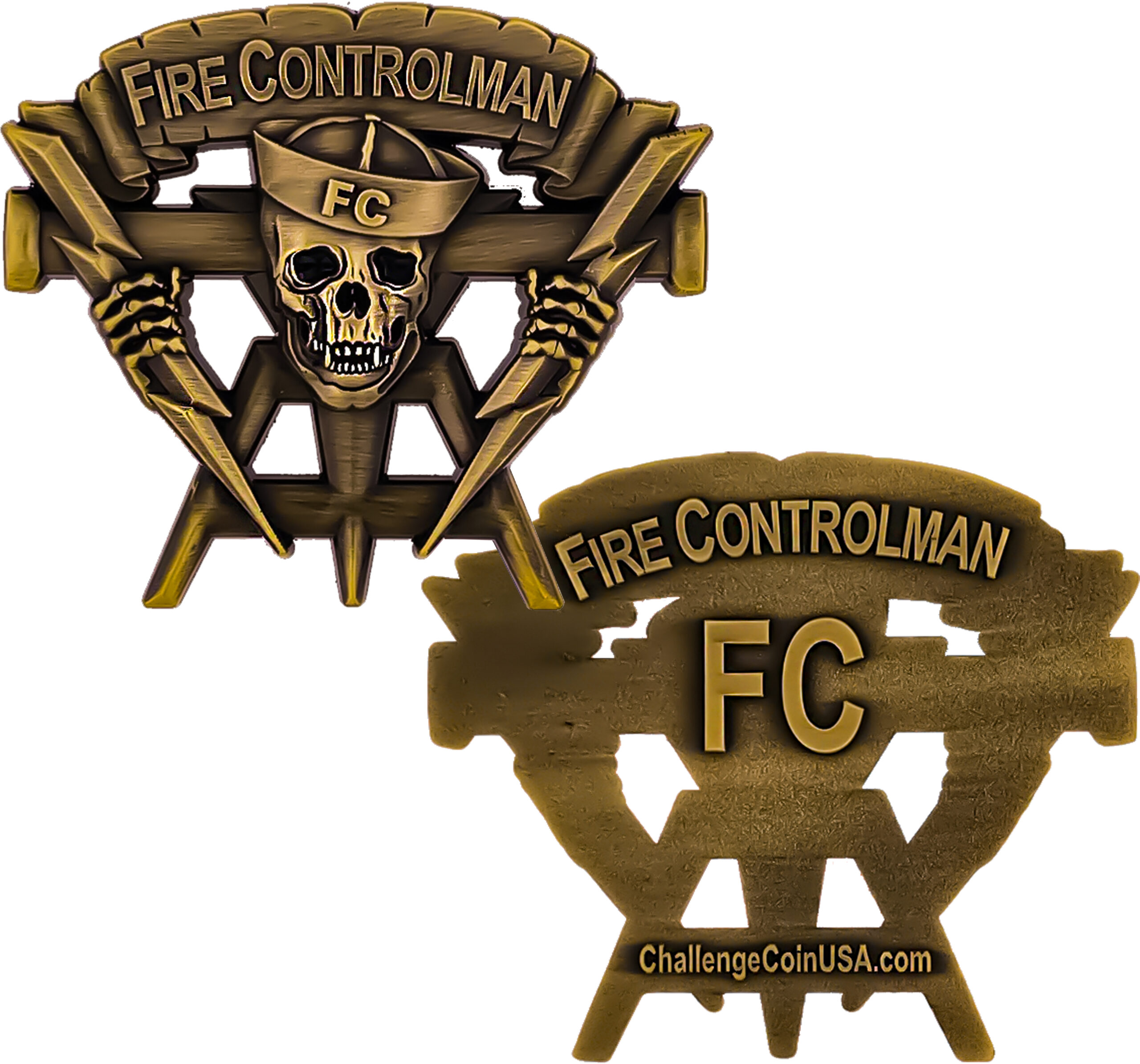 Fire Controlman “FC” custom shape 2.5 antique gold challenge coin. Fire Controlman is a navy occupational rating. Fire controlmen provide system employment recommendations; perform organizational and intermediate maintenance on digital computer equipment, subsystems, and systems; operate and maintain combat and weapons direction systems, surface-to-air and surface-to-surface missile systems, and gun fire control systems at the organizational and intermediate level.